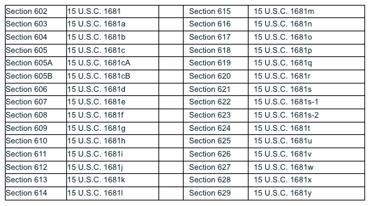 10. Citations for FCRA sections in the U.S. Code, 15 U.S.C. § 1681 et seq.: