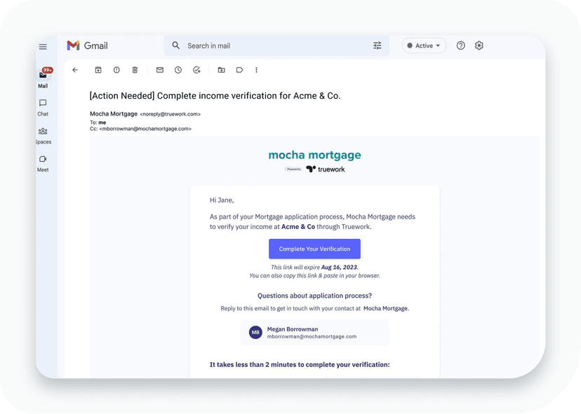To help accelerate completions, Truework administrators can now CC borrowers and verifiers on the same verification email thread. Applicants can easily follow up with questions and verifying teams can reach out to applicants directly if the verification still needs to be completed.