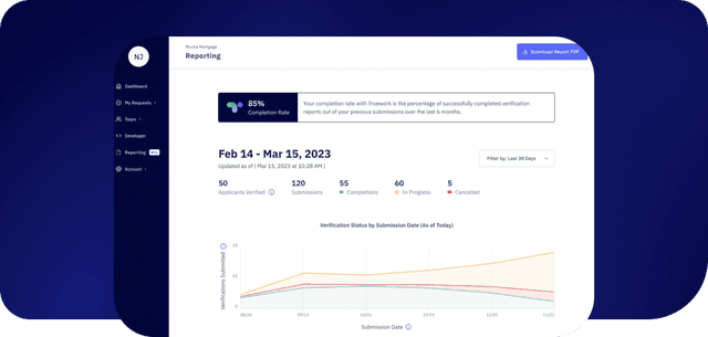 Truework Admins can now glean deep insights into how their team is using the Truework platform with detailed dashboards and performance metrics. Admins can view completion rates, turnaround times as well detailed cancellation reasons all from the Truework web app dashboard.