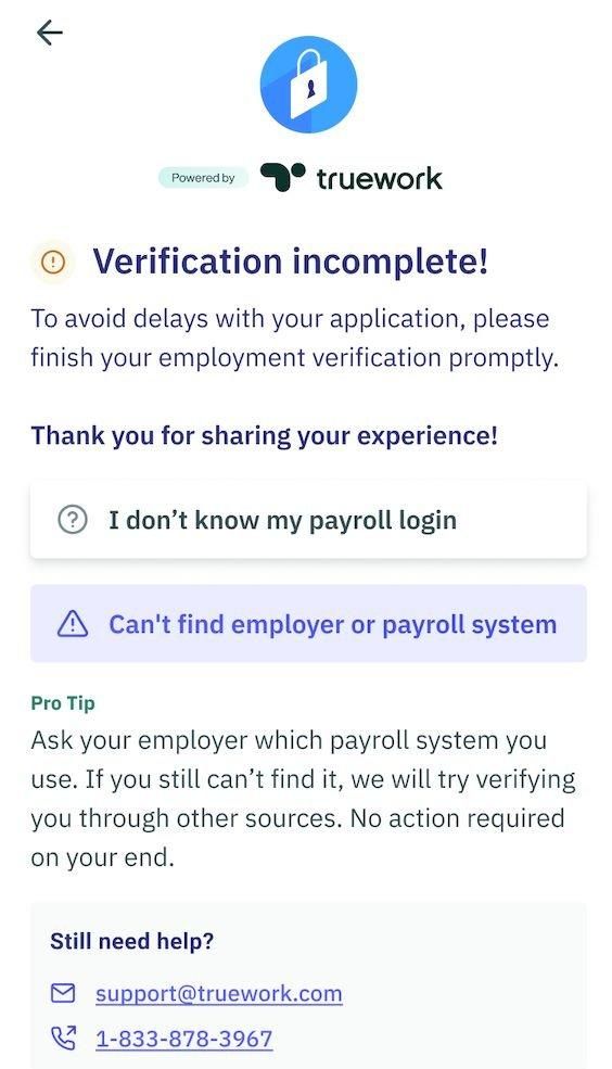 Additionally, we provide every applicant with our support email and direct phone line to ensure they can talk to a Truework support representative in real-time and resolve any issues as quickly as possible.