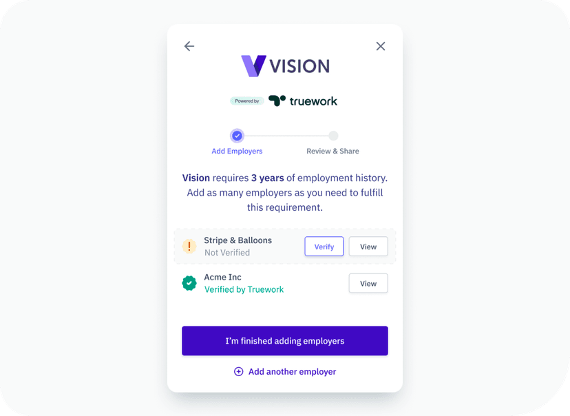 Once initiated, the Truework Income for POS experience lets any borrower verify their income with an easy-to-use workflow. Instead of waiting for a loan processor to run a verification, Truework Income digitizes and streamlines the verification experience in a few easy clicks.